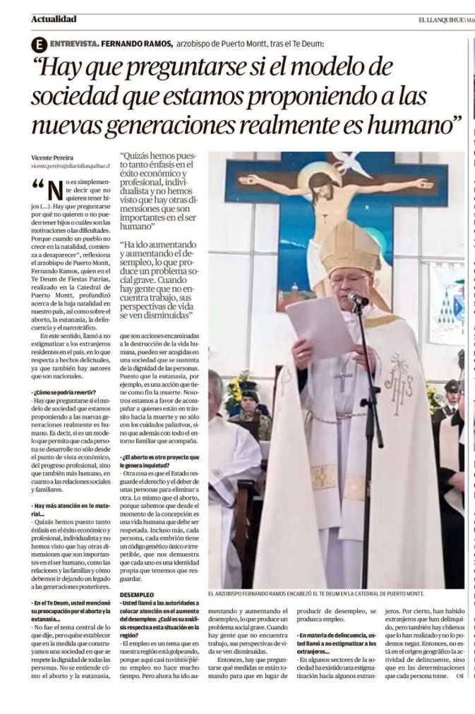 ‘No es simplemente decir que no quieren tener hijos (…). Hay que preguntarse por qué no quieren o no pueden tener hijos o cuáles son las motivaciones o las dificultades. Porque cuando un pueblo no crece en la natalidad, comienza a desaparecer’, reflexiona el arzobispo de Puerto Montt, Fernando Ramos, quien en el Te Deum de Fiestas Patrias, realizado en la Catedral de Puerto Montt, profundizó acerca de la baja natalidad en nuestro país, así como sobre el aborto, la eutanasia, la delincuencia y el narcotráfico.