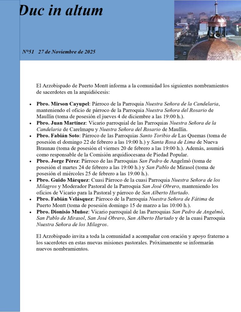El Arzobispado de Puerto Montt informa a la comunidad los siguientes nombramientos de sacerdotes en la arquidiócesis: