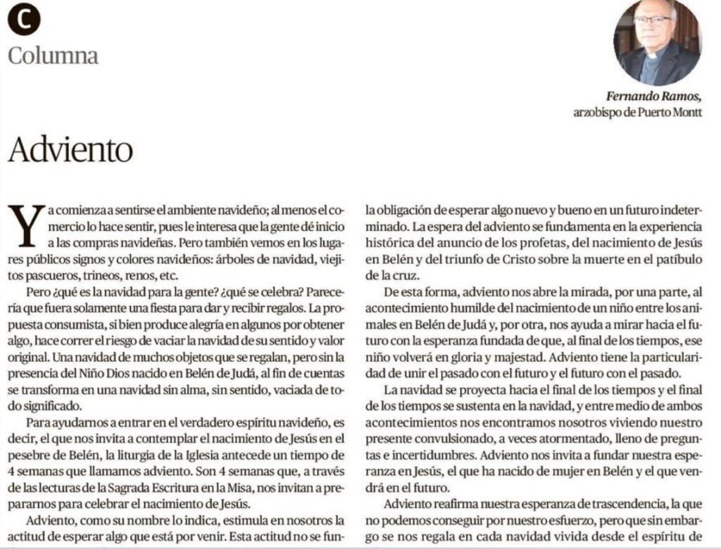 De esta forma, adviento nos abre la mirada, por una parte, al acontecimiento humilde del nacimiento de un niño entre los animales en Belén de Judá y, por otra, nos ayuda a mirar hacia el futuro con la esperanza fundada de que, al final de los tiempos, ese niño volverá en gloria y majestad. Adviento tiene la particularidad de unir el pasado con el futuro y el futuro con el pasado. La navidad se proyecta hacia el final de los tiempos y el final de los tiempos se sustenta en la navidad, y entre medio de ambos acontecimientos nos encontramos nosotros viviendo nuestro presente convulsionado, a veces atormentado, lleno de preguntas e incertidumbres. Adviento nos invita a fundar nuestra esperanza en Jesús, el que ha nacido de mujer en Belén y el que vendrá en el futuro. Adviento reafirma nuestra esperanza de trascendencia, la que no podemos conseguir por nuestro esfuerzo, pero que sin embargo se nos regala en cada navidad vivida desde el espíritu de adviento.