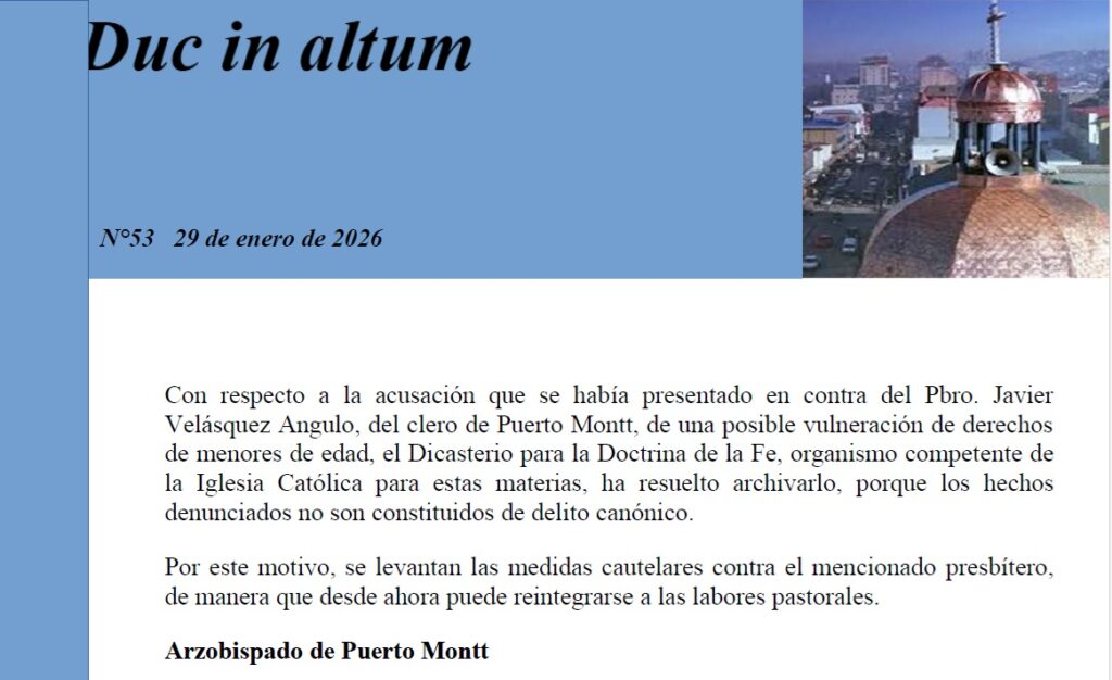 Con respecto a la acusación que se había presentado en contra del Pbro. Javier Velásquez Angulo, del clero de Puerto Montt, de una posible vulneración de derechos de menores de edad, el Dicasterio para la Doctrina de la Fe, organismo competente de la Iglesia Católica para estas materias, ha resuelto archivarlo, porque los hechos denunciados no son constituidos de delito canónico. Por este motivo, se levantan las medidas cautelares contra el mencionado presbítero, de manera que desde ahora puede reintegrarse a las labores pastorales.